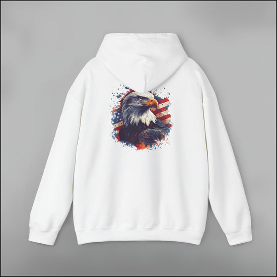 • Detailed eagle portrait with flag and splatter backdrop—proud, bold, unmistakably American