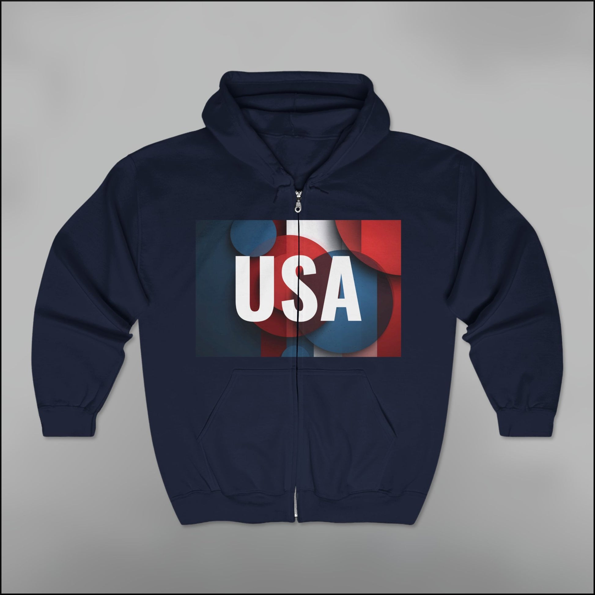 • Layered USA artwork with circular flag elements on a rugged full-zip hoodie