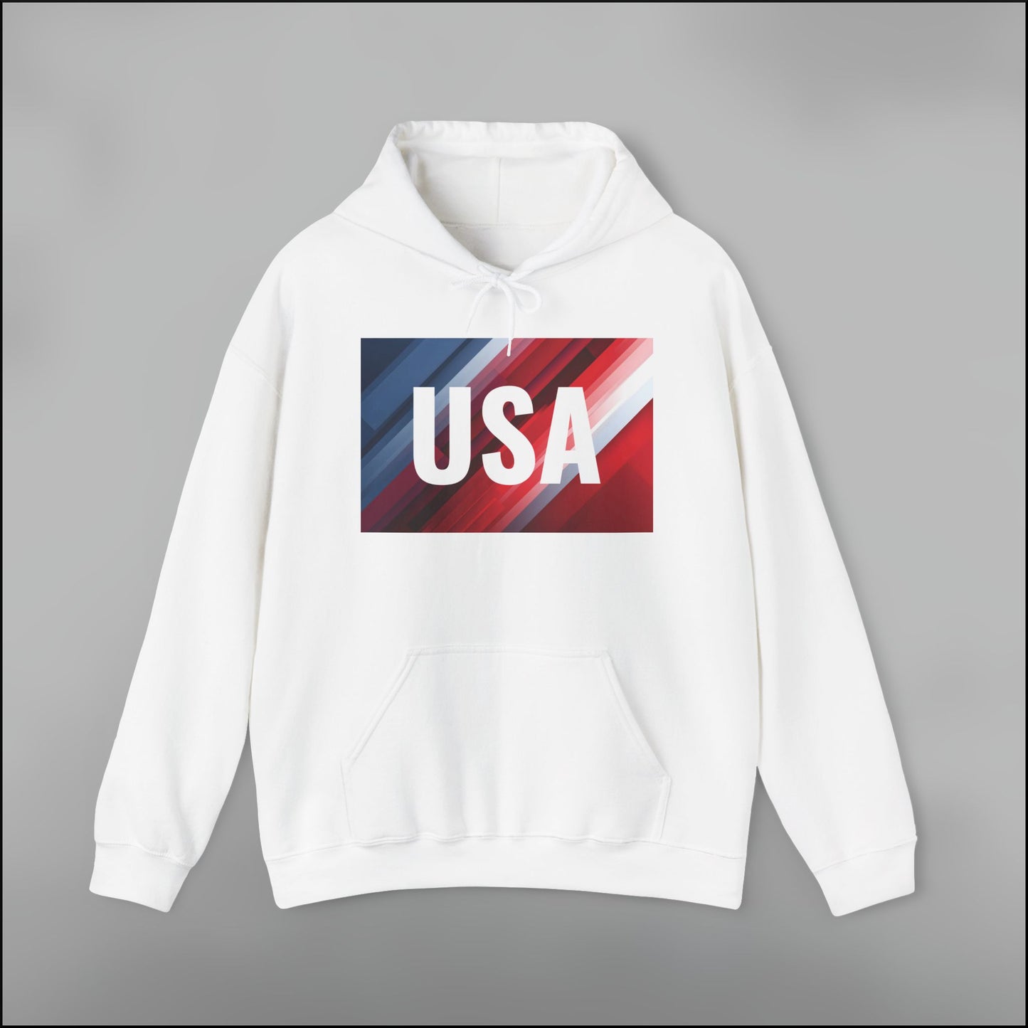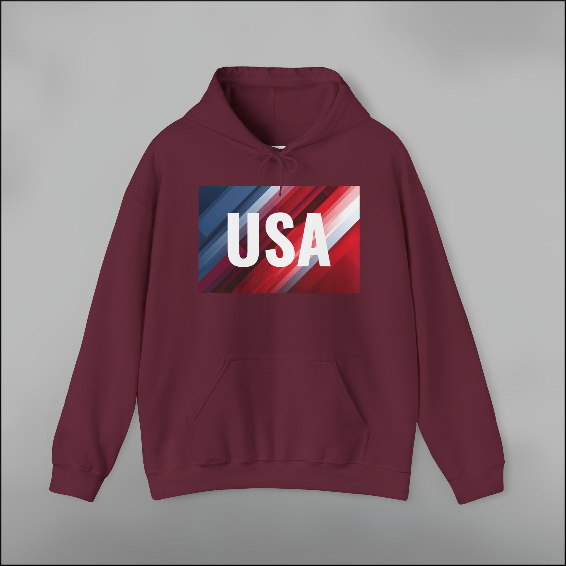 - Diagonal USA print with high-energy motion stripes and bold color contrast