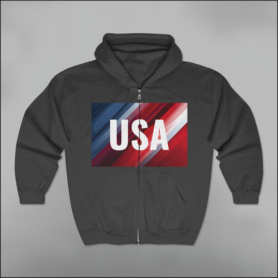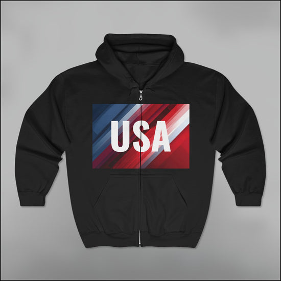 • Striking diagonal USA graphic with kinetic color flow and zip-front impact