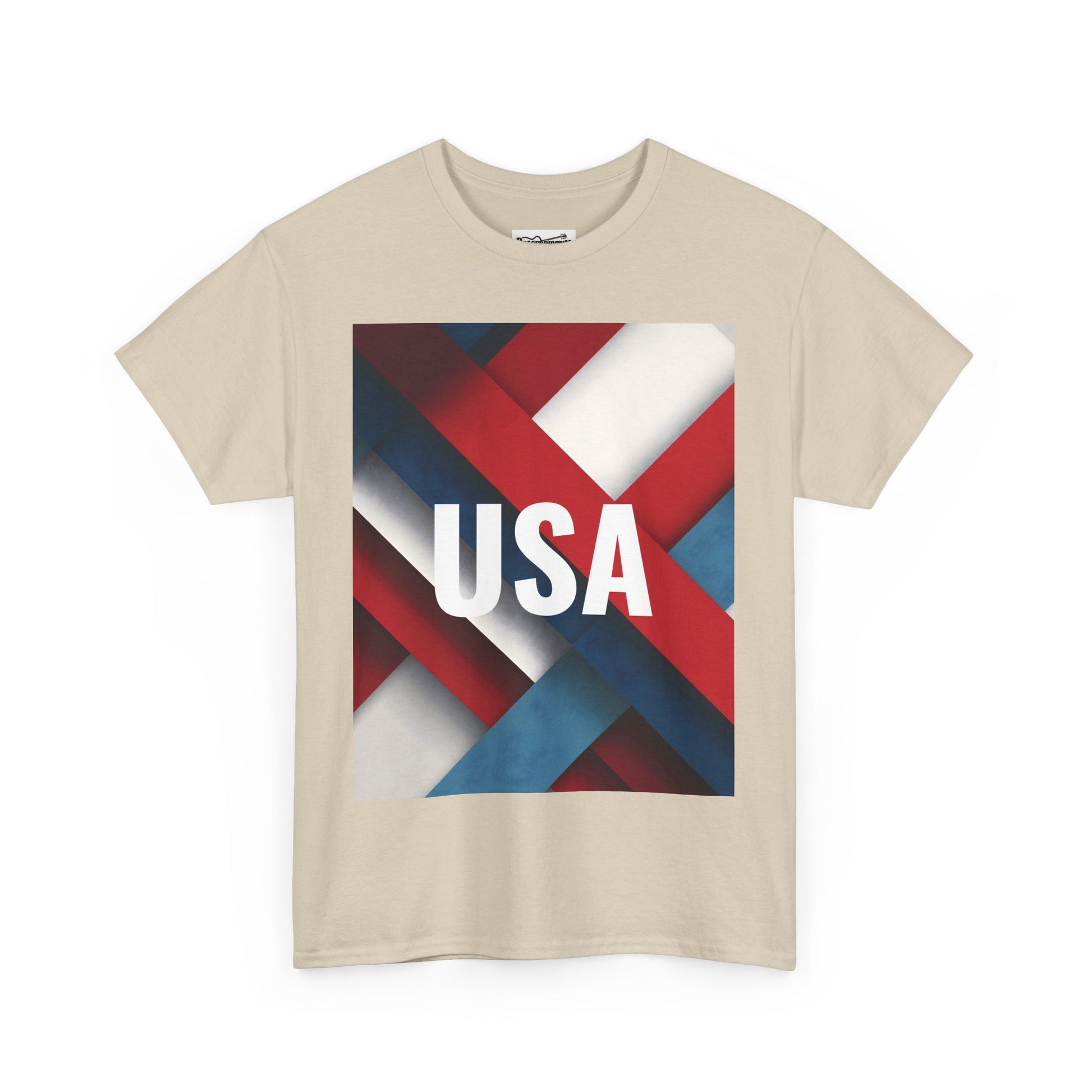 • Layered stripe pattern with bold USA lettering and sharp patriotic geometry